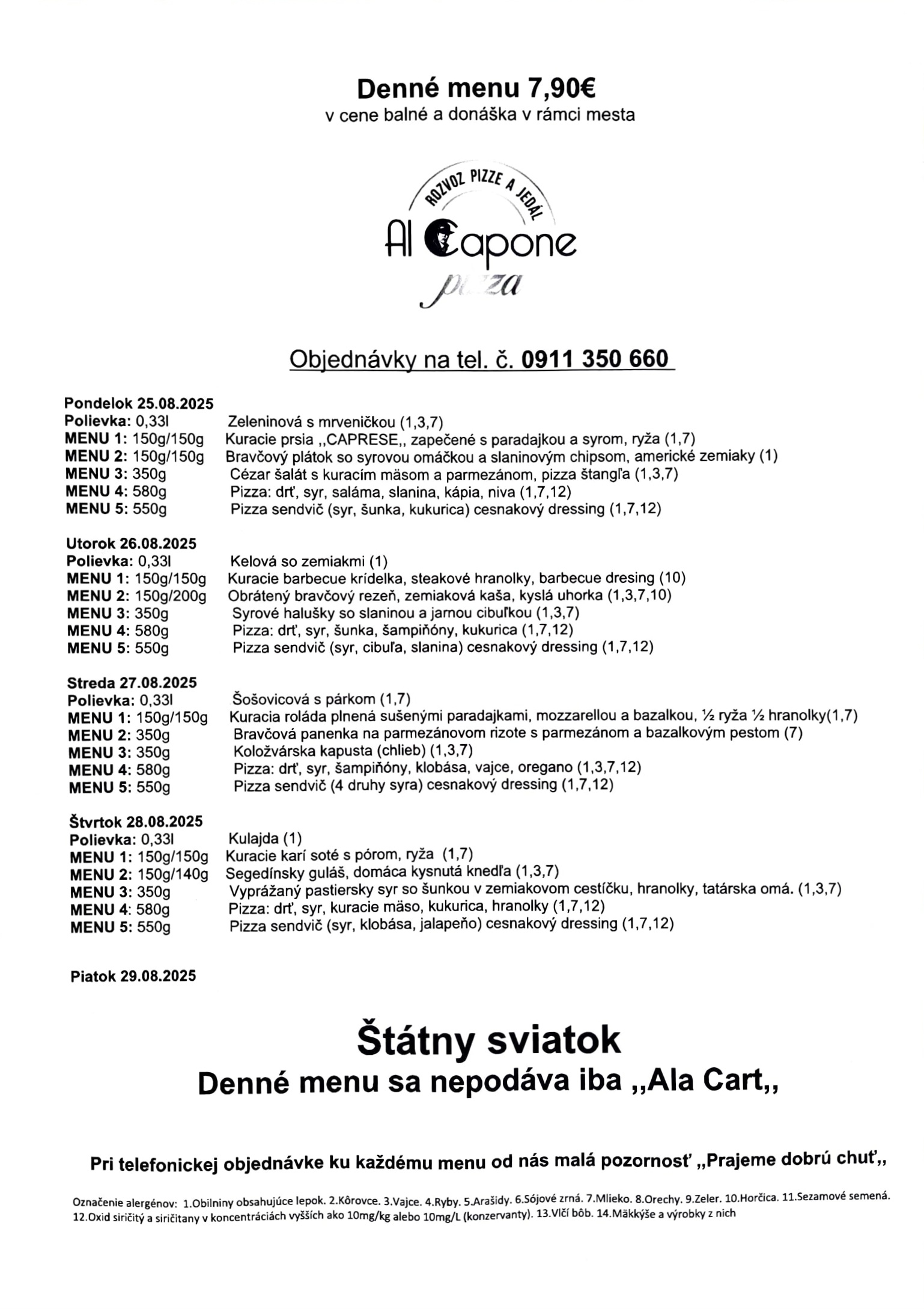Vitajte v Pizza Al Capone v Kysuckom Novom Meste. Tešíme sa na vašu návštevu. Čaká vás skutočná pohostinnosť a skvelý výber talianskej a slovenskej kuchyne. Náš priateľský personál vám ponúkne tie najlepšie jedlá z tradičnej, haute cuisine a nouvelle cuisine. Zoberte so sebou svojich priateľov a rodinu a vychutnajte si náš burger a pizzu. Môžete si tu dopriať naše lahodné palacinky. K dispozícii je aj osviežujúce pivo. V tichom a relaxačnom prostredí si vychutnajte chutný obed a večeru.